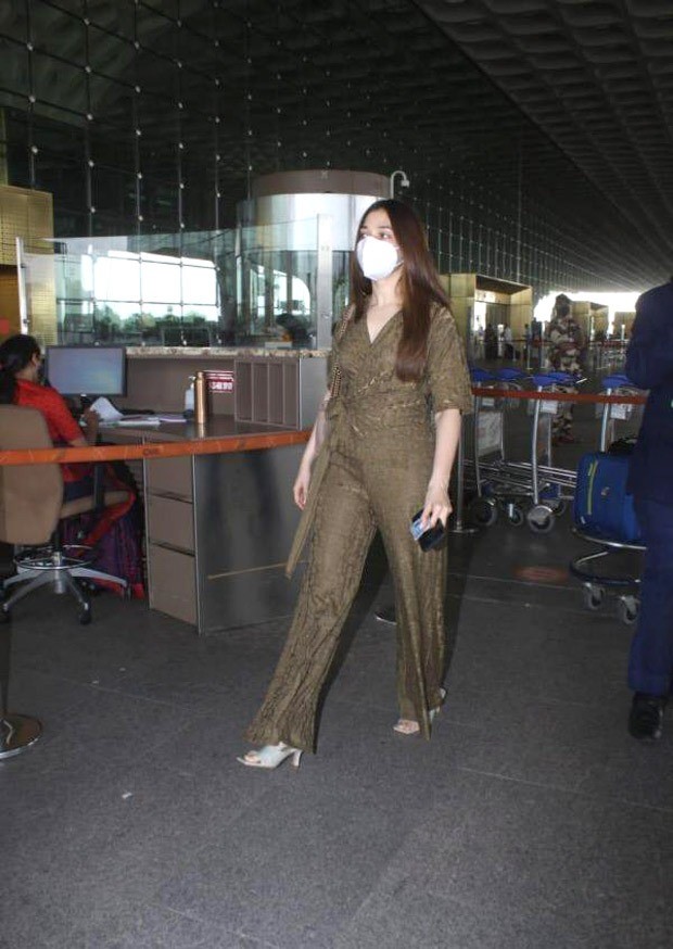 Kriti Sanon impressed in a flannel co-ord set with checkered pants and a cover up that she paired it with a light brown halter neck top. She kept her hair open as she completed her look with a black Rice Gauche Tote, chunky white sneakers, sunglasses and a mask that reads 'Vaccinated'. Fashion and health in check for this actress.