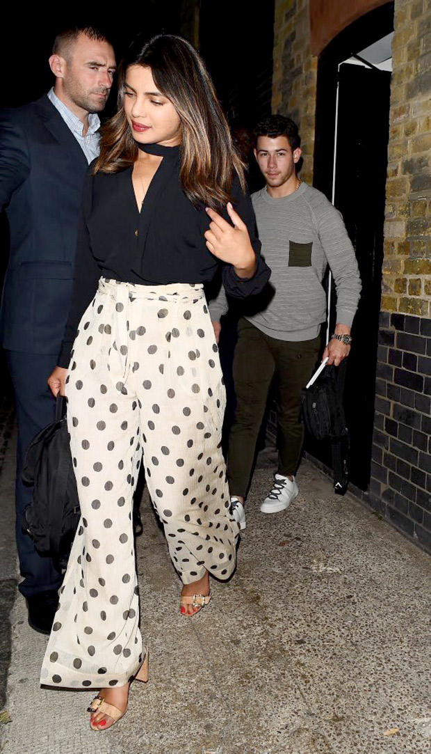 As a loving boyfriend, Nick Jonas took his girlfriend Priyanka Chopra for birthday dinner during their stay in London last night. The hot new couple was seen together stepping out of a restaurant after their date night when paparazzi caught them. They were at Chiltern Firehouse in London. Priyanka looked pretty in polka dots white pallazos with black top with dark lips and simple makeup. Nick kept it casual in grey t-shirt and black pants as he stepped out with Priyanka after dinner.