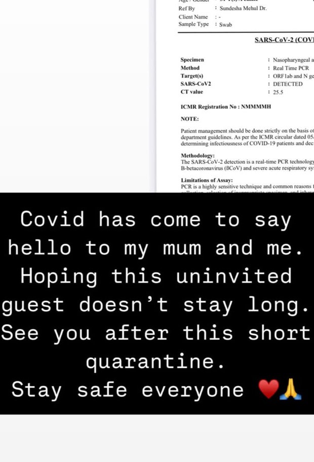 Nikita Dutta shared her COVID report on her Instagram stories along with a note that read, “Covid has come to say hello to my mum and me. Hoping this uninvited guest doesn't stay long. See you after this short quarantine. Stay safe everyone.”