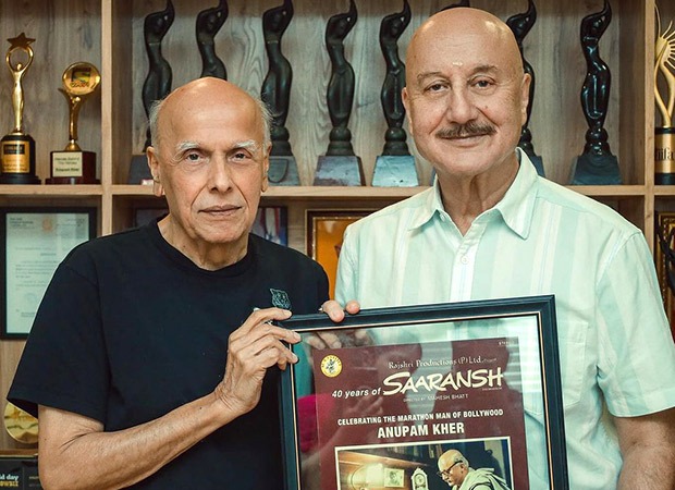 Anupam Kher is marking 40 years of his remarkable career in the Indian film industry. Having made his debut in Mahesh Bhatt’s 1984 film Saaransh, Kher shared a heartfelt post expressing gratitude to his first director. “Sometimes pictures don’t capture all the emotions,” he wrote, accompanied by a series of photos featuring him and Bhatt with a Saaransh memento. The memento, likely a gift from the director, bore a special message, “Celebrating The Marathon Man Of Bollywood.”