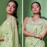 Anushka Sen managed to win hearts once more with the grandeur of her saree by wearing sparse earrings, a pink shimmering smokey eye makeup, lots of highlighter, reddened cheeks and tied her hair in wavy ponytail as the finishing touches to her glam appearance.