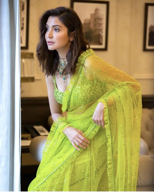Anushka's saree featured a sheer lime green section that was covered in dazzling embellishments. Along the hem, the plain drape also had a softly ruffled border. Anushka's choice to pair the eye-catching saree with an all-sequined blouse was a bold fashion choice. The brilliant blouse really increased the outfit's glam factor. Anushka accessorised her appearance solely with a dramatic neckpiece that was bejewelled and studded with precious stones, leaving her side-parted, textured hair down to her shoulders.