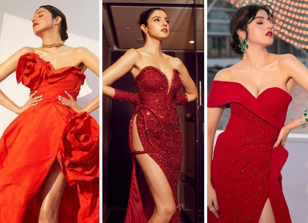 Making a dramatic statement, Divya adorns a gown with huge roses and a thigh-high slit. Perfectly paired with red stilettos and a gold choker, her bun, and red lip complete the look, showcasing a perfect blend of boldness and sophistication.