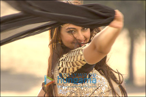 Bollywood Hungama discovered a few images of the actors while they were shooting for a song from the film. In the first one, Sonakshi Sinha is seen in an Indian avatar with black silver sequined lehenga choli, dancing away to glory.