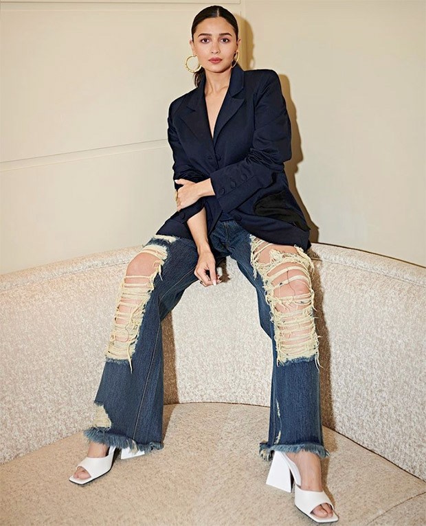 One of the most successful Bollywood actors working now is Alia Bhatt. The actress, who has been in a number of well-known movies, has distinguished herself not just for her stellar on-screen work but also for her impeccable sense of style and appearance and once again she left us swooning with her style. On Tuesday, Alia posted photos of herself serving a boss woman moment while wearing a stylish blazer and distressed denim jeans to her Instagram profile. Alia’s timeless black blazer is from the racks of Moonray. Lapel collar and a patch pocket with a hand-painted and beaded moon flower were highlights of the single-breasted blazer. Additionally, the actress wore dark-washed Huemn jeans with a wide-leg silhouette. The tattered accents on the jeans were undoubtedly a statement. Her outfit is worth Rs. 34,000.