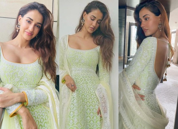 Disha Patani opted for a desi look this time around from Asal by Abu Jani and Sandeep Khosla. Disha looked bespoke in a heavily embroidered attire. The white embroidery was an overlay for the soft neon green hues. Disha looked beautiful in a deep neck Anarkali with a dupatta. The dress also featured a deep back with a tie up. Disha’s makeup was simple with soft shimmer and highlights and her hair in bouncy curves. The actor looked stunning in the desi attire and flaunted her curves.