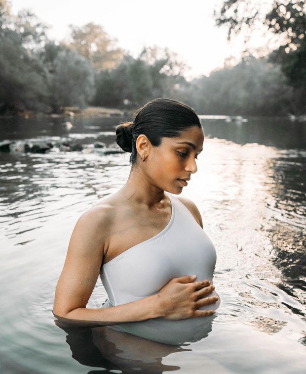 Freida Pinto uploaded snaps donned a white one shoulder white bodysuit. The body suit hugs her in just the right places. She is seen lying on a log of wood near a lake and she shines with the new mommy glow. She looks beautiful as she thanks everyone for their wishes and love.