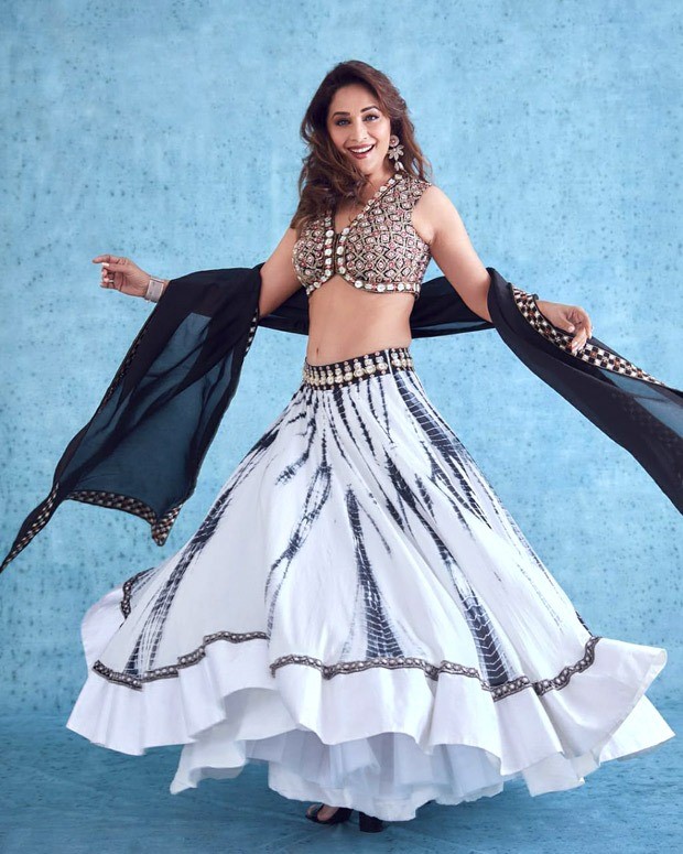 Madhuri Dixit is the icon for Indian dressing. For Dance Deewane 3, Madhuri stunned everyone with her modern styled mirror work lehenga from Reeti Arneja designs. She was seen wearing a halter neck heavily embroidered blouse with mirror work and a tie-dye print lehenga. The simple ethnic look was elevated with intricate embroidery and mirror work featuring a flat silk, velvet and georgette base. It is paired with a matching jacket blouse and a cape dupatta. The Reeti Arneja lehenga is worth Rs. 53,760.