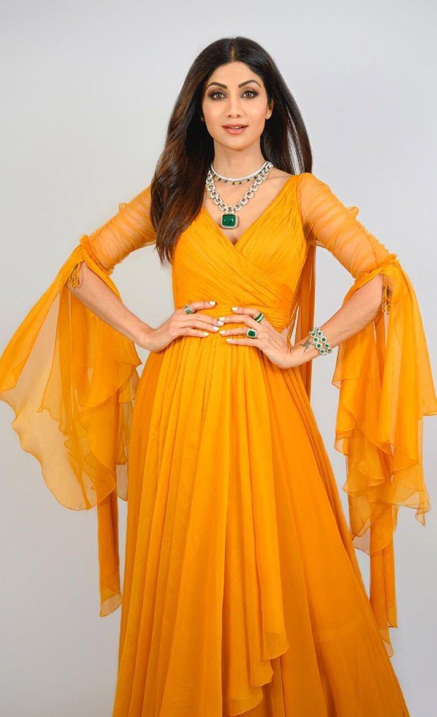 Shilpa Shetty is a stunner. Shilpa donned a gorgeous flowy, sheer orange number from Tarun Tahiliani and we cannot stop going gaga over it. She looked as fresh as a daisy with emerald laden jewelry, soft makeup and blow dried hair.