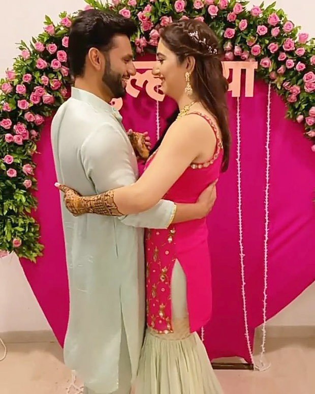 For the mehendi function, the bride was glowing in a hot pink outfit. Disha Parmar wore a sleeveless hot pink mirror work kurta with white sharara pants. She looked beautiful with her hands filled with henna. Rahul Vaidya, on the other hand, was seen in silk mint blue kurta pajama by his bride’s side. They both looked like a match made in heaven.
