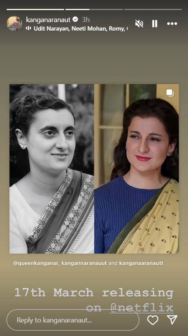 Kangana Ranaut re-shared a fan post on social media featuring collages of her and former Prime Minister Indira Gandhi. Alongside it, she simply wrote, “17th March releasing on @netflix.” Emergency, which premiered in theaters on January 17, will be available on Netflix from March 17.