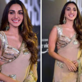 Kiara Advani stuns in a beautiful beige gold saree with intricate work for another promotional appearance. She was stunned by the trendy bling of the drape from Manish Malhotra. Kiara looked absolutely stunning as the saree hugged her in all the right places. She paired it with a sweetheart plunging neck backless blouse. Kiara’s makeup was shimmery and dewy with her hair in soft waves.