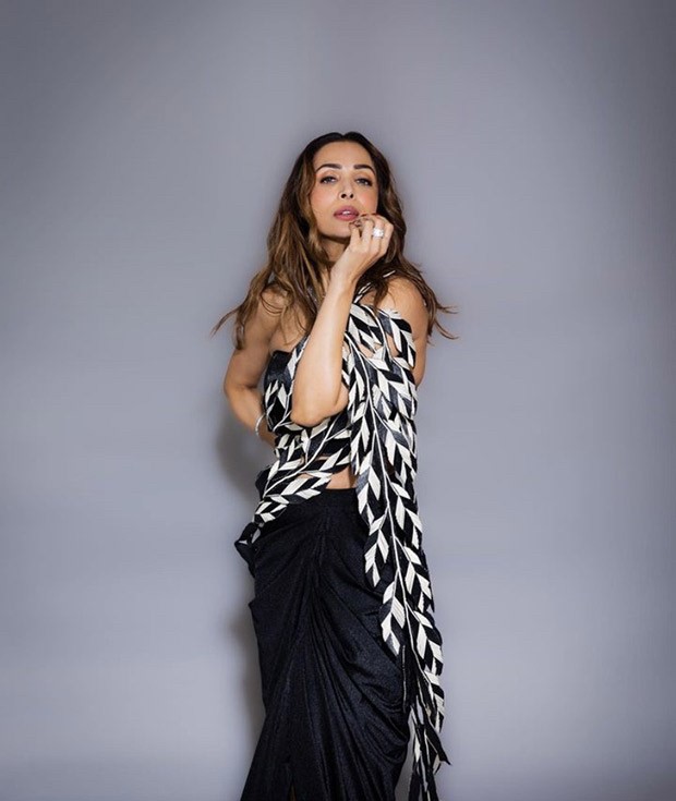 Malaika Arora shared photos of herself wearing a striking monochromatic saree on Tuesday on Instagram. Malaika's saree is a piece from the Rimzim Dadu collection, styled by Maneka Harisinghani. A stunning addition to a contemporary woman's wardrobe, the striking six yards are available in a black and white colour scheme. The feathered pallu of Malaika's statement saree is gracefully draped over her shoulder and is black and white in colour. Moreover, it has an asymmetric hem, a front thigh-high slit, and a pre-draped silhouette with waterfall pleats. Malaika paired the six yards with a backless, strapless tube blouse with a fitted bust and a plunging neckline.