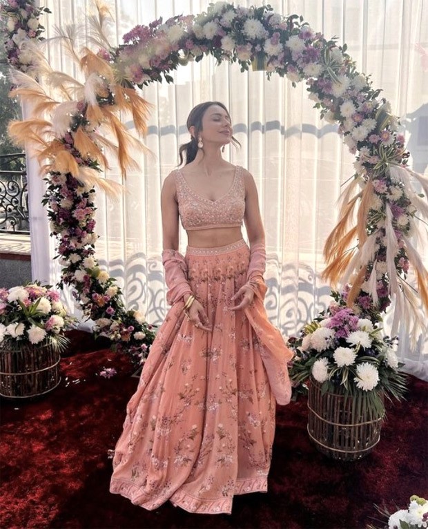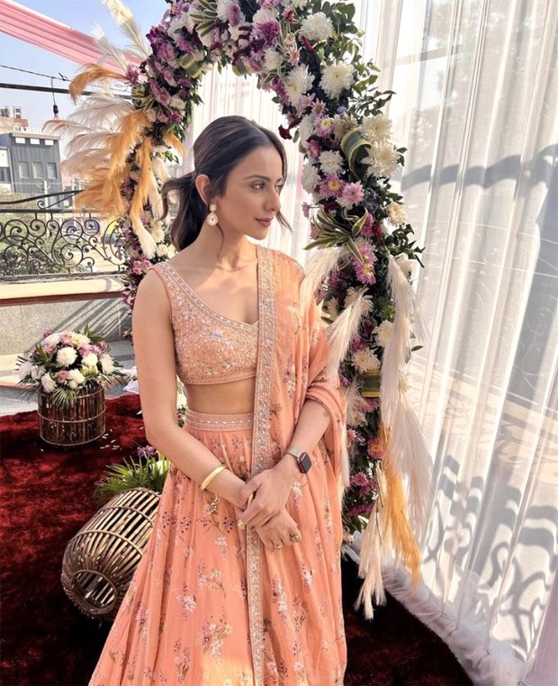 Rakul Singh made sure her lehenga was the centre of attention by wearing only delicate earrings and a stack of kadas as accessories. She put her hair up in a ponytail and applied subtle caramel tones to her makeup. She captioned her post as, “Winter sun and wedding season”