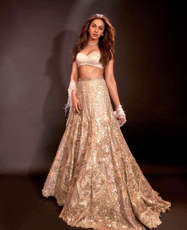 Every time the diva wears an ethnic item, Rakul Preet Singh manages to raise the standard for glitz and glamour. Rakul selected a stunning metallic lehenga from the designer line Tarun Tahiliani for Sidharth Malhotra and Kiara Advani's wedding reception, which was held in the city over the weekend. The elegant lehenga skirt of the dazzling ensemble was covered with sparkling sequined lace embroidery. The actress paired it with a strapless blouse that was covered in tiny sequins. Rakul wore a sheer dupatta with the dress and chose a studded choker necklace as her lone jewellery piece. Her ethnic appearance looked stunning with luscious lips, well-contoured cheeks, and glam makeup with sparkly eyelids.