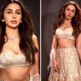 Every time the diva wears an ethnic item, Rakul Preet Singh manages to raise the standard for glitz and glamour. Rakul selected a stunning metallic lehenga from the designer line Tarun Tahiliani for Sidharth Malhotra and Kiara Advani's wedding reception, which was held in the city over the weekend. The elegant lehenga skirt of the dazzling ensemble was covered with sparkling sequined lace embroidery. The actress paired it with a strapless blouse that was covered in tiny sequins. Rakul wore a sheer dupatta with the dress and chose a studded choker necklace as her lone jewellery piece. Her ethnic appearance looked stunning with luscious lips, well-contoured cheeks, and glam makeup with sparkly eyelids.