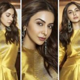 Rakul Preet Singh is promoting Chhatriwali, her forthcoming movie, nonstop. We are fortunate in that her classy approach to movie promotion will benefit us for days to come. This time, she opted for an Indian fusion look, wearing a brocade jumpsuit by Payal Khandwala. Rakul chose a golden jumpsuit that was adorned with gold tones. It's attractive and cosy at the same time. This jumpsuit was manually woven from silk, combining structure and drape. The casual silhouette is stylish and easy while yet being elegant and boho. Her jumpsuit includes a round neck, half sleeves, and an asymmetric hem. A straightforward yet striking jumpsuit is always a good choice because it not only makes a subtle statement but also enhances Rakul's form. Her dress costs 29,800 rupees. You would know that Rakul has a thing for huge, statement earrings if you kept up with her fashion escapades. She chose a few bangles and some silver danglers as her accessories once more. Her hair was simply left open, and her makeup was minimal. By wearing the kohlapuris together, the actress elevated the picture and combined the best elements of two different looks.