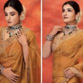 On Thursday, Bollywood stars descended upon Anil Kapoor's home for the Karwa Chauth celebrations. For the occasion, Shilpa Shetty, Raveena Tandon, Bhavana Pandey, Neelam Kothari, Rima Jain, Maheep Kapoor, and Natasha Dalal all wore traditional attire. The lovely Raveena Tandon added glitz to the event. She looked lovely in a yellow saree from Jigar Mali designs with gold floral embroidery. Her saree has scalloped borders with silver embroidery on it. She wore a blouse with a similar colour to her saree. She accessorised her saree with earrings and a necklace with a polki decorated with emerald stones. The stack of bangles she added gave her a more regal appearance. Raveena ultimately decided on a centre-parted sleek hairstyle accented with flowers, sleek black eyeliner, glossy nude lip colour, delicate eye shadow, flushed cheeks, mascara on the lashes, dewy base, sharp contouring, and dazzling highlighter as her glam options. She captioned her post as, “#Karhwachauthready #kesariya is my rang for the season…. ????♥️.”