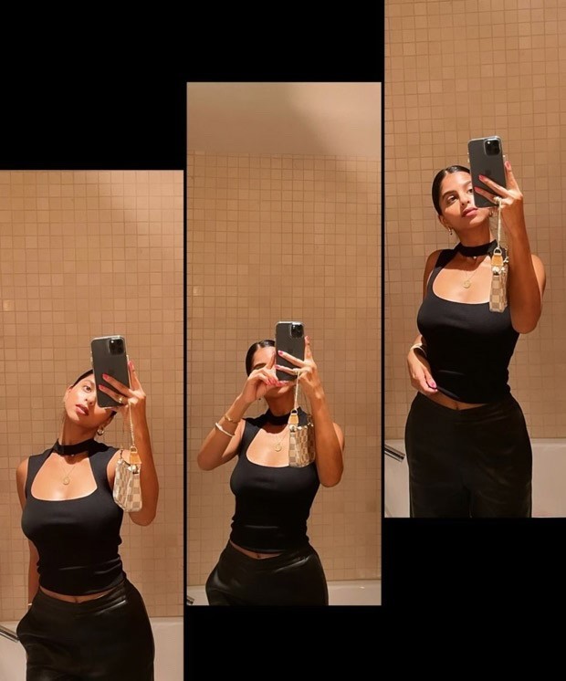 On Thursday, Suhana shared a burning hot mirror selfie of herself on her Instagram story which is turning heads. She is seen in the all-black sexy outfit, a black fitted sleeveless collar strap top along with a matching leather bottom.