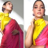 With her variety of statement outfits, Tamannaah Bhatia, who enjoys a good scene-stealing moment, has never failed to provide one. Her sense of style has always been impeccable, with everything from casual chic to on-the-ramp glamour. But what really stands out are her show-stopping sarees. Even though the actress's schedule is packed with social engagements and photo shoots, she always finds time to spoil her stylish clan. In a stunning Sabyasachi saree, she once again embodied ageless grace. Tamannaah's color-blocked saree made a statement. The flowing border of the saree is red with floral designs sewn onto it; the body of the saree is pink. The yellow blouse has a pussybow on the front as an additional accent and a high collar.