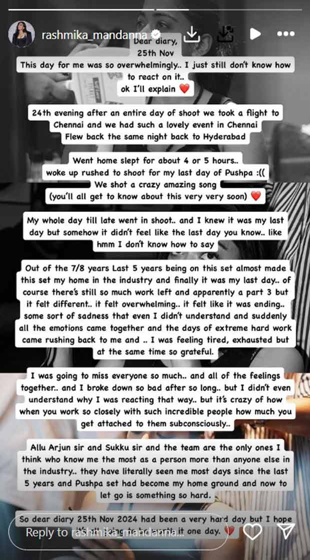 Rashmika wrote in a heartfelt post on her Instagram story, “Dear diary, 25th Nov. This day for me was so overwhelmingly… 24th evening after an entire day of shoot we took a flight to Chennai and we had such a lovely event in Chennai..Flew back the same night back to Hyderabad..Went home slept for about 4 or 5 hours..woke up rushed to shoot for my last day of Pushpa."